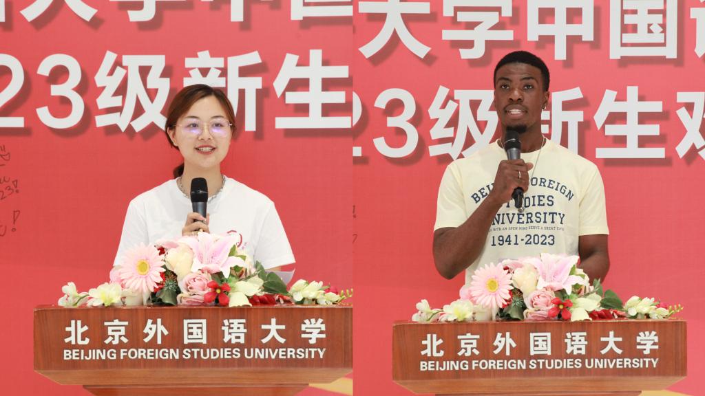 国歌缓缓响起,会场由签名时的欢声笑语转向庄严肃穆,迎新大会正式拉开帷幕。2023级中国本科生冯香涵、留学生后羿(来自喀麦隆)作为新生代表发言,字字句句折射出与北外ac米兰官方中文网站邂逅的满心欢喜与前景展望。冯香涵同学提出以“归零心态”打开全新征程,并号召同学们将来能够用所学为国家为人民做点事情。后羿同学怀揣对中国与中文的热爱来到北外校园,追寻自己的梦想,以乐观的心态奔赴即将到来的大学生活,并期待将汉语文化带给世界。