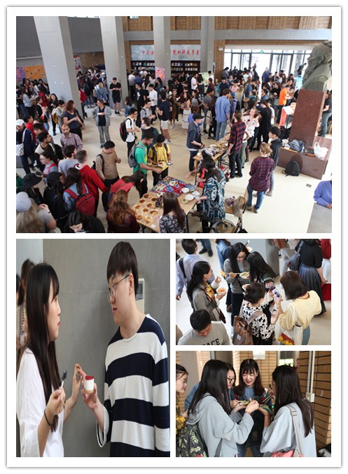 更为值得一提的是,为了招揽顾客,同学们想出了各种各样的点子,有的大声叫卖、有的穿统一的民族服装、有的跳集体舞、还有的甚至把广告牌挂在身上到处走动,同时每个摊位都设有微信支付功能,这种场面让广大的师生颇受感染,他们积极与留学生进行互动交流,盛况超前。
