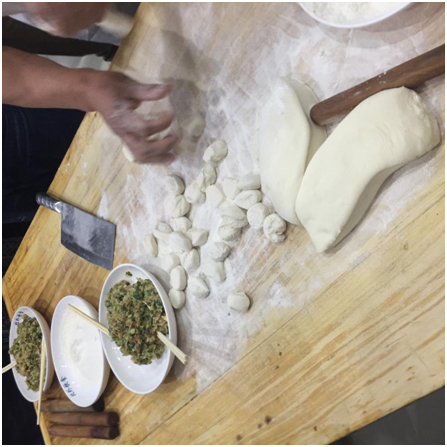 大部分学员此前都没有包饺子的体验,在学员的期待中,经验丰富的面食师傅首先向大家展示了包饺子的步骤和技巧,博得了阵阵赞叹。接下来,学员和老师们一起动手,开始了“艺术创作”。