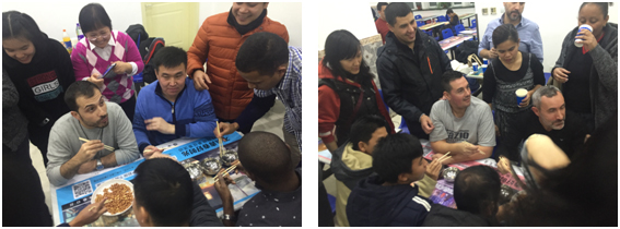 尽管做不到像师傅那样包得又规整又迅速,但学员们却做到了创意十足,有的学员还不能熟练擀皮,就将面饼擀成薄薄一大片,用圆形小碗扣出饺子皮的形状,有的学员展示了自己国家的饺子模样,有的学员则将饺子包成了心形、星星形状,也十分别致。经过一个小时的共同努力,饺子终于下锅了,接下来学员们进行了热闹有趣的夹花生米比赛。学员们来到中国已经两个多月,已经能够比较熟练地使用筷子了,但是一投入比赛的氛围之中,还真是有点紧张呢!经过个人赛、班级赛两个组别的比赛,诞生了第12期执法联络员项目夹花生米最高纪录——29个/分钟。