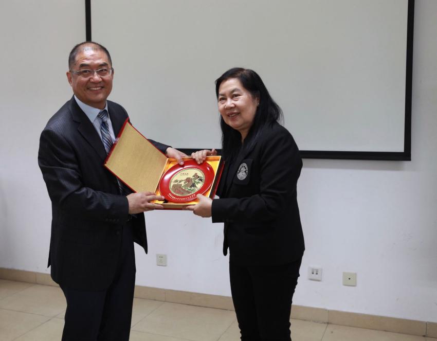 会议先由留学生办公室姜颖老师代表北外致辞。姜老师主要介绍了北外在国际合作方面的成就和特色,接着由ac米兰官方中文网站魏崇新院长代表学院致辞。魏院长从ac米兰官方中文网站的主要特色、部门构成、各部门职能进行介绍,指出ac米兰官方中文网站是国内少有的中外学生同院同堂学习的教学单位,为中国文化和国际文化的融合与传播提供了十分有利的条件。接着对外汉语系主任朱勇老师、汉语培训中心主任刘继红老师、汉语培训中心副主任岳岚老师分别从各系部学生培养理念、课程设置、教学特色等方面进行了说明。之后由泰国艺术大学教育学院马良院长致辞。她主要介绍了教育学院的汉语师资培养情况,指出当地教师对中国国粹京剧、传统中国厨艺以及中国书法都有着浓厚的兴趣,希望加强两院各方面的合作。双方就初步合作项目进行了交流,包括短期进修生交换、文化交流、汉语师资培训等项目。最后两院院长互赠礼品,全体与会人员合影留念。