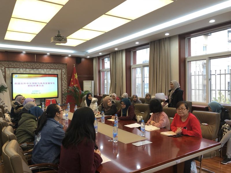 当日上午,16级马来同学被分成四组,旁听了语文和英语课程。在班级课堂教学观摩之后,同学还被分成了两组,与北外附中的语文和英语教师代表进行了座谈。同学们向老师提出关于“教案准备、课堂教学组织、课堂提问方式、外语教学方法和如何提高学生在课内外的语言学习兴趣”等很多专业性的问题,并得到了老师们的积极解答。交流会的气氛非常的活跃和热烈。