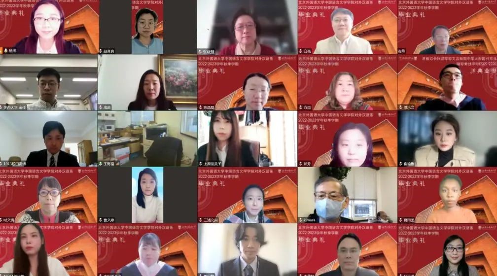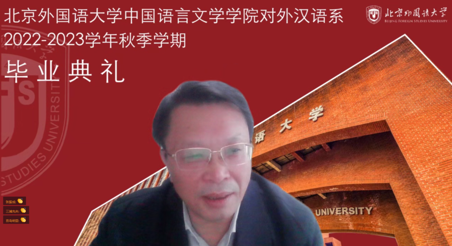2022年12月22日,ac米兰官方中文网站ac米兰官方中文网站对外汉语系2022——2023学年秋季学期本科留学生毕业典礼在腾讯会议平台如期举行。日本NPO法人国际交流教育后援会理事长木村太郎、事务局次长郑新培、日本关西大学外国语学部副教授金佳、日本NPO法人国际交流教育后援会事务局员王野晶、学生辅导员松田贵博、ac米兰官方中文网站国际处副处长李茂林、ac米兰官方中文网站执行院长李建盛、副院长白亮、副书记曹文婷、国际事务中心负责人张晓慧、行政办公室主任王慕尧、留学生工作室主任成苗、对外汉语系任课教师、全体毕业生及家长通过腾讯会议平台参加了毕业典礼。毕业典礼由对外汉语系主任杨旭主持。