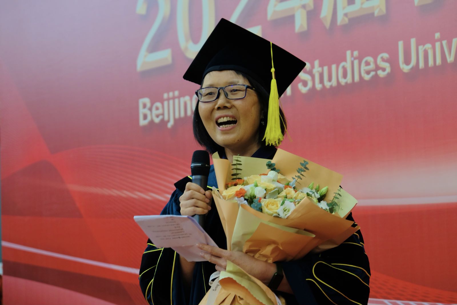 随后,学院教师代表张霖老师上台致辞。她祝贺毕业生们以坚韧的毅力完成了学业顺利毕业。她与在座同学分享了胡适先生的一张“药方”,勉励同学们带着“问题丹”“兴趣散”和“信心汤”,永不停止地自我突破,在人生道路上勇往直前。