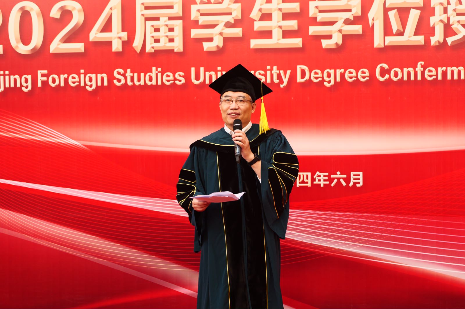 学位授予仪式由院学位委员会主任高育花教授主持。何辉教授、李建盛教授、研究生导师熊文新教授和王继红教授为学院2024届毕业生拨穗授予学位。