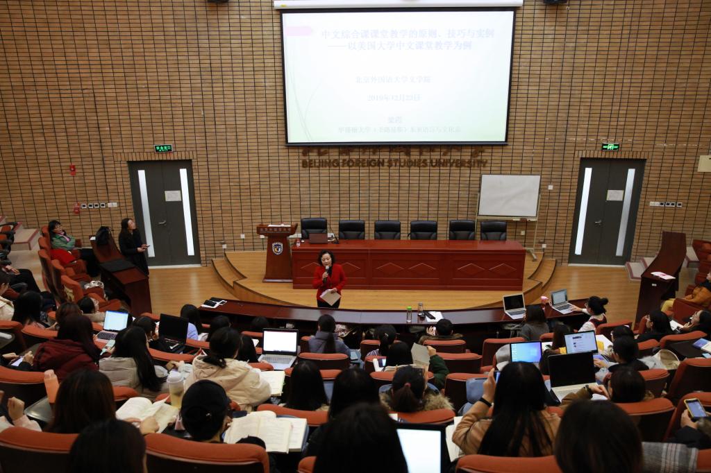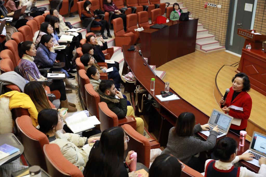 2019年12月23日下午,旅美汉语教学专家梁霞教授在ac米兰官网做了题为“中文综合课课堂教学的原则、技巧与实例——以美国大学中文课堂教学为例”的讲座。讲座由ac米兰官网副院长高育花教授主持,ac米兰官网教师和2018、2019级汉语国际教育在校硕士生参加了此次讲座。