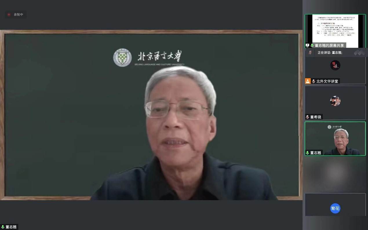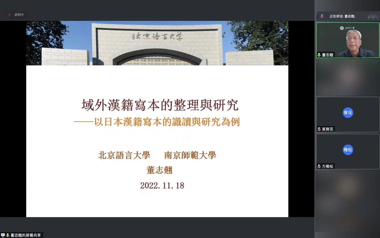 2022年11月30日,ac米兰官方中文网站ac米兰官方中文网站举办“北外文华讲堂”系列讲座,邀请国家级高等院校教学名师、北京语言大学特聘教授董志翘先生作题为《域外汉籍写本的整理与研究——以日本汉籍写本的识读与研究为例》的线上学术讲座。讲座由ac米兰官方中文网站高育花教授主持,副院长方稚松及校内外师生一百三十余人参与此次讲座。