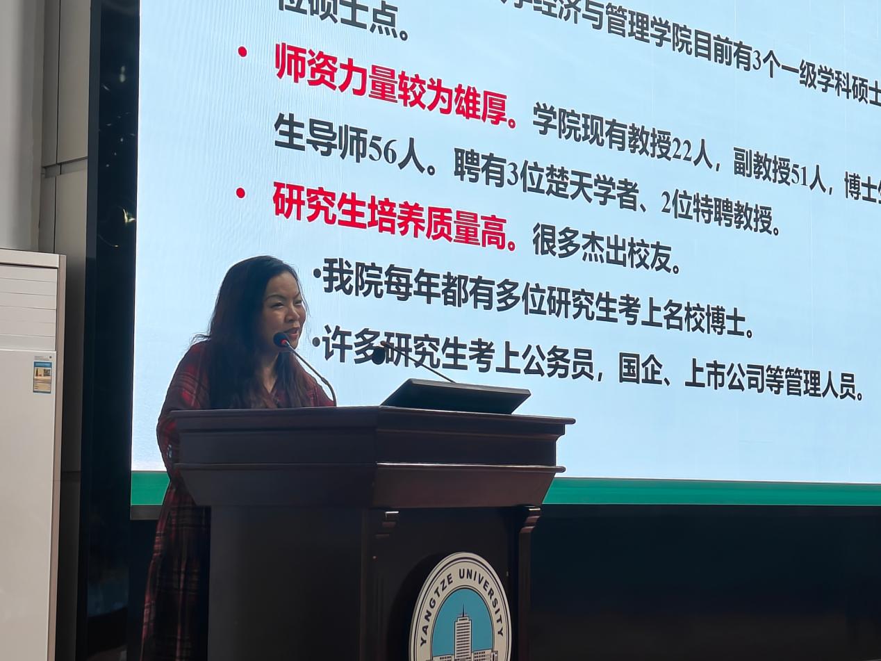 会上,裴潇对tyc234cc 太阳成集团研究生招生工作进行介绍。她向同学们介绍了学位点以及招生录取的相关数据,提到我院优良的招生政策,为同学们的发展方向提供思路。