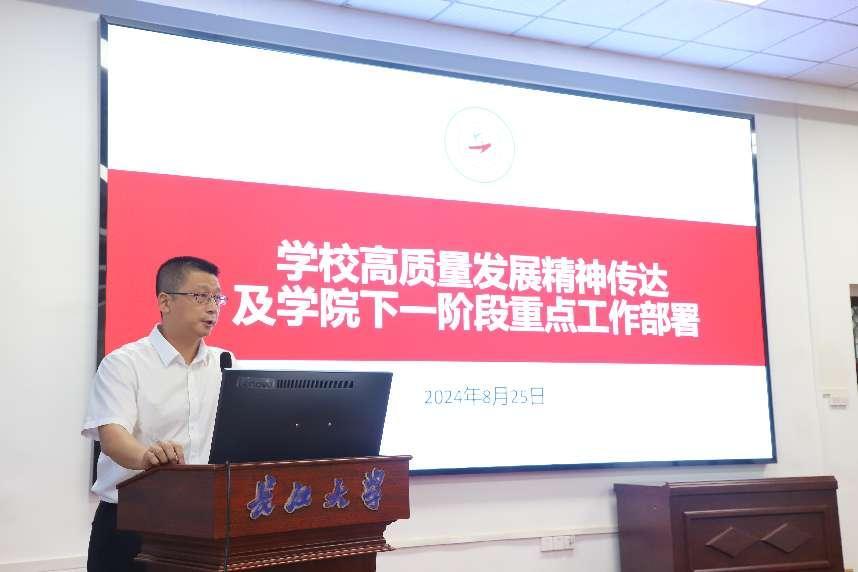 学院副院长何蒲明以“认清形势,明确任务”为题,从学院学科建设的基本现状、科研任务完成情况、后期主要工作等三个方面出发,指出学院目前在相关工作中的不足之处,提醒老师们要明确努力的方向,为学院高质量发展贡献力量;副院长裴潇从学位点评估、研究生招生、研究生培养、研究生新生入学工作等四个方面做了工作安排,并特别强调了学位点评估工作面临的挑战,传达了前期学位点核验和评估阶段专家反馈的意见和建议,对老师们提出了相应的要求,动员大家齐心协力做好整改工作;副院长王华强针对开学第一周上课准备、开学补考、毕业生学分核验、毕业论文抽检、毕业生推免等做了详细的工作安排;党委副书记平先锋就学生工作做了重要提示,先是向老师们通报了暑期学生工作开展情况,接着就近期的开学报到工作、毕业生就业工作、新生入学工作、工会工作等进行了详细部署。