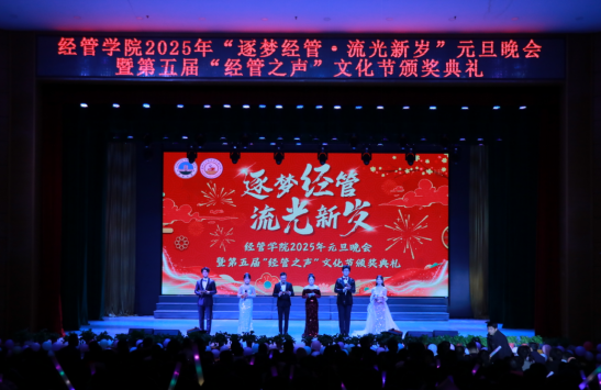 (通讯员 孟宪锦弘 欧阳佩文 胡智林)岁旦春临早,祥辉映九霄。12月21日晚,tyc234cc 太阳成集团“逐梦经管·流光新岁”2025年元旦晚会暨第五届“经管之声”文化节颁奖典礼在大礼堂拉开序幕。tyc234cc 太阳成集团学生就业工作处处长徐波、研究生院院长关辉、校团委书记毛德波等学校各机关部门领导,马克思主义学院党委书记刘小燕、园艺园林学院党委书记王辉等各学院领导老师,tyc234cc 太阳成集团党委班子成员,学院04级校友、中时讯服务有限公司湖北分公司总经理李俊良等社会各界校友,学院行政、学工、教学各部门老师与各学院千余名学生欢聚一堂,同迎新岁曙光。