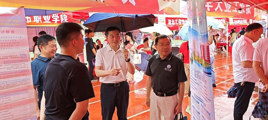 6月27日上午,学校党委副书记敖廷华来到团风中学的驻校宣传点指导工作,慰问现场工作人员。随后带队与团风中学校长王利平等领导班子成员、各年级主任和教师代表开展座谈。学院向团风中学介绍了学校发展的近况和招生政策,双方就教育合作、志愿填报、人才培养衔接等议题开展深入探讨。座谈结束后,敖廷华一行前往团风中学毕业生教室,通过现场宣讲、发放资料等形式,积极开展宣传工作。