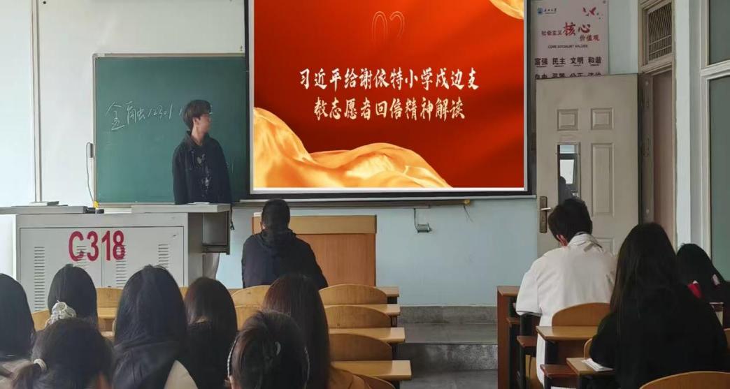 学院各团支部集中学习习近平总书记给新疆阿图什市哈拉峻乡谢依特小学成边支教西部计划志愿者服务队全体队员回信精神,通过PPT学习、分享个人感受等形式,结合个人实际,深入探讨如何坚定理想信念、厚植家国情怀、练就过硬本领。